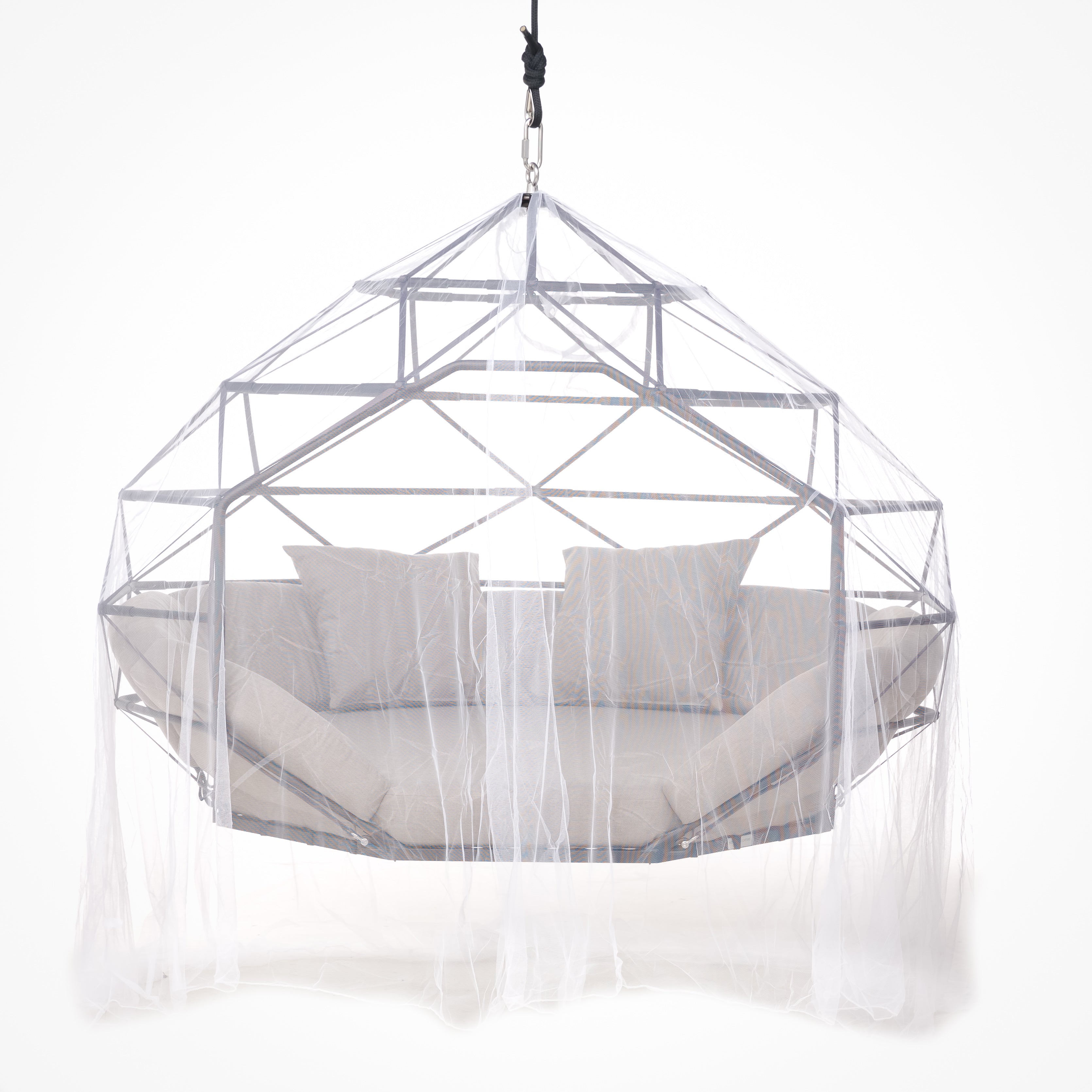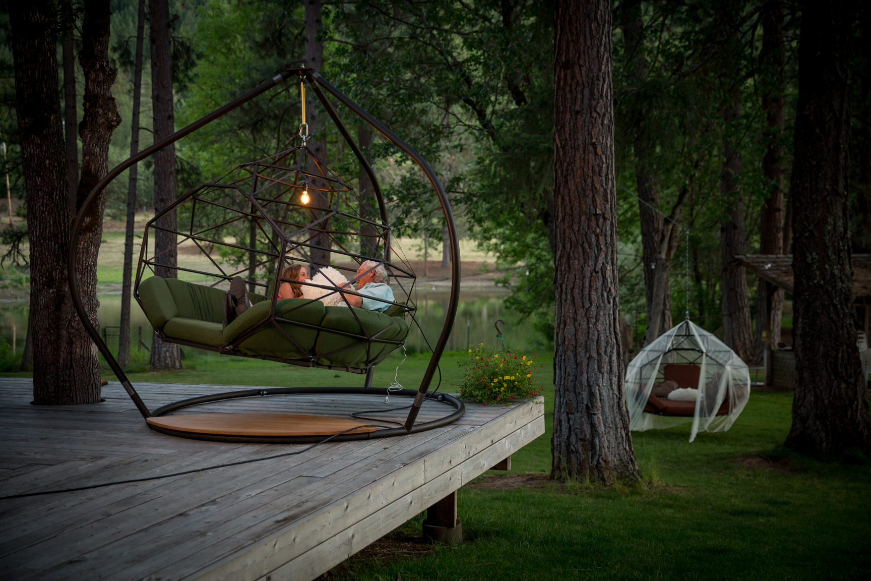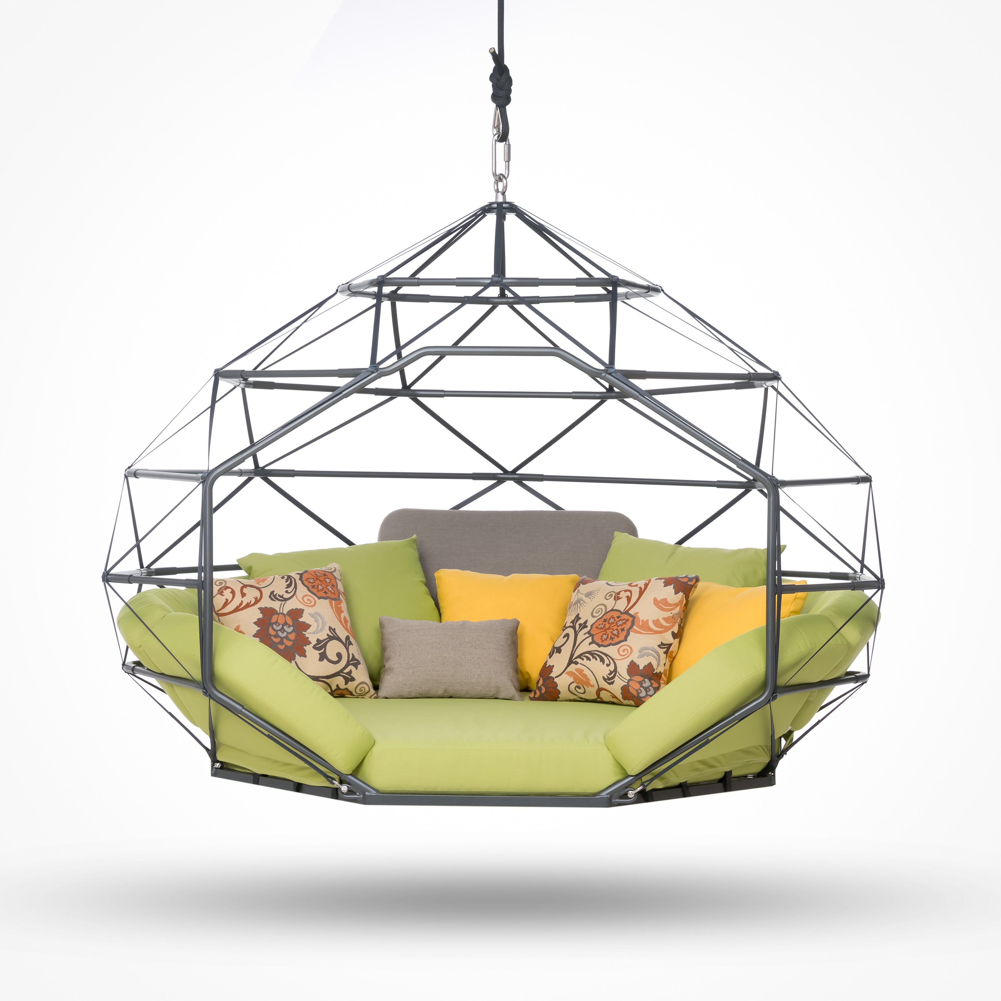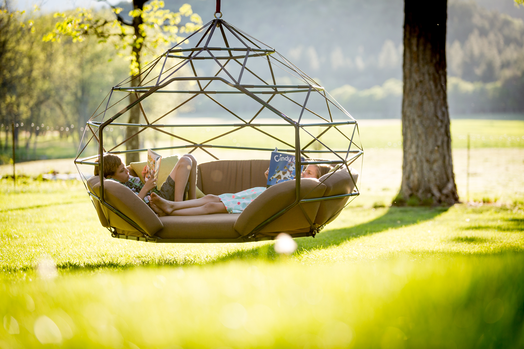 The Kodama Zome is the next evolution of the hammock.  These geodesic dome inspired structures hang from a single overhead anchor, allowing for smooth and unrestricted pendulum motion in any direction. The gentle swaying is reminiscent of rocking in a cradle, and it is the perfect spot to relax with you self or with friends and enjoy the afternoon.