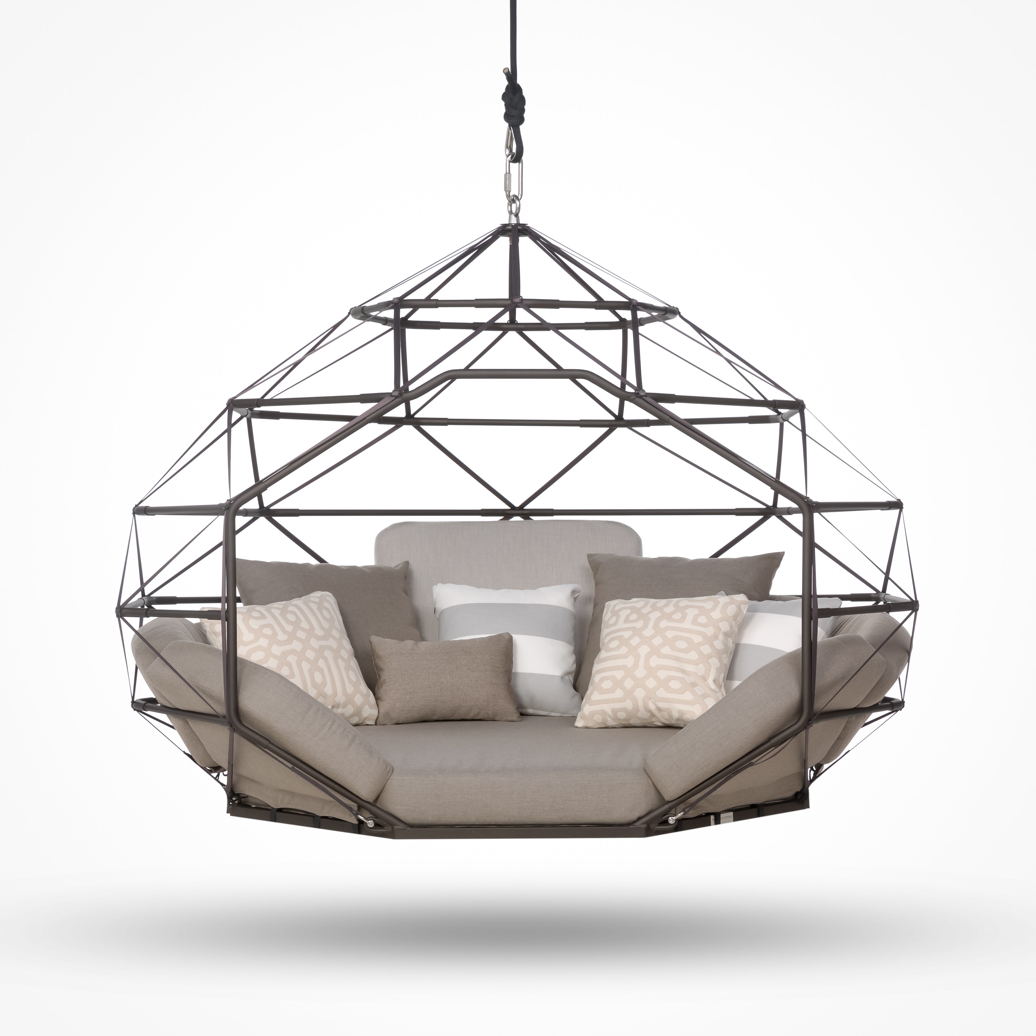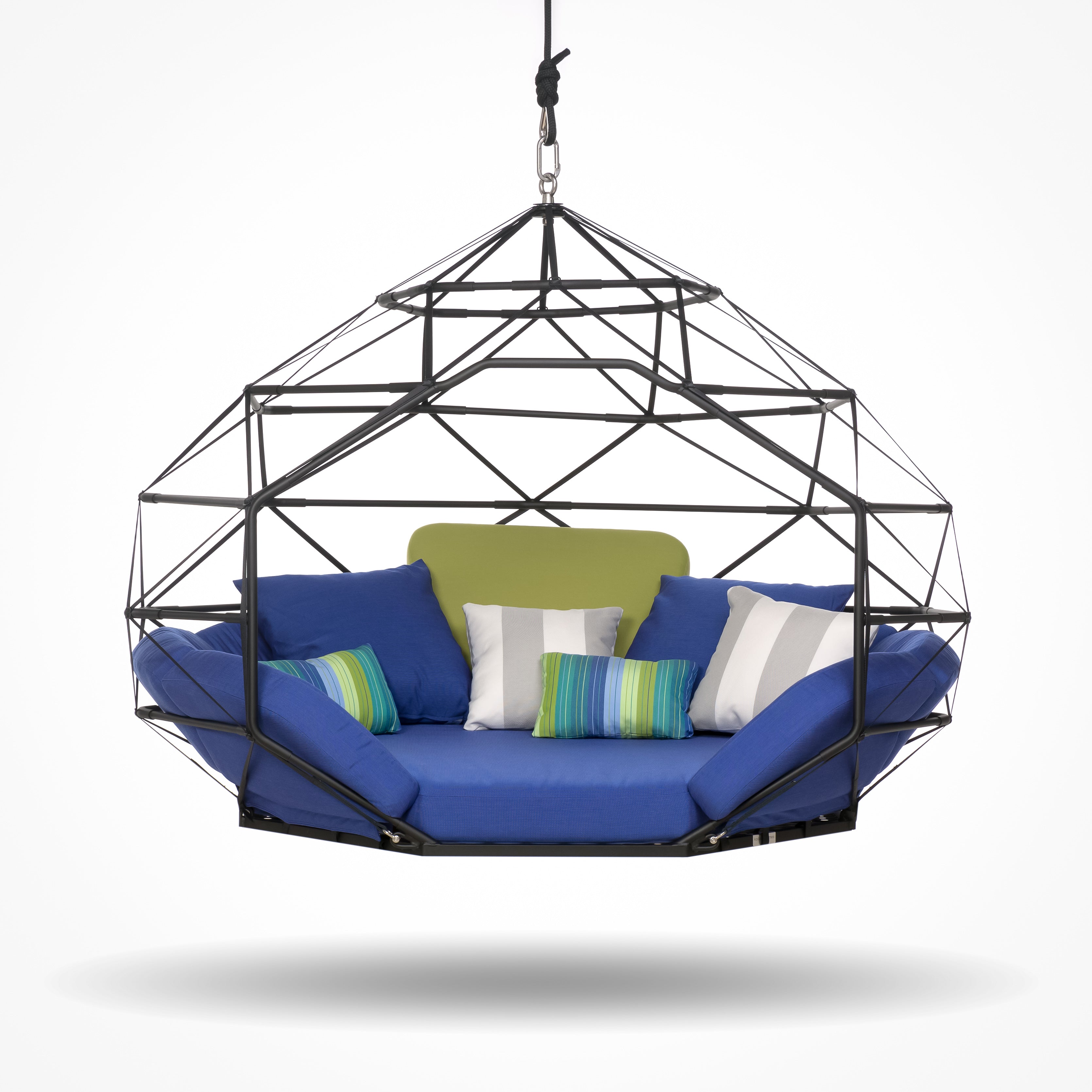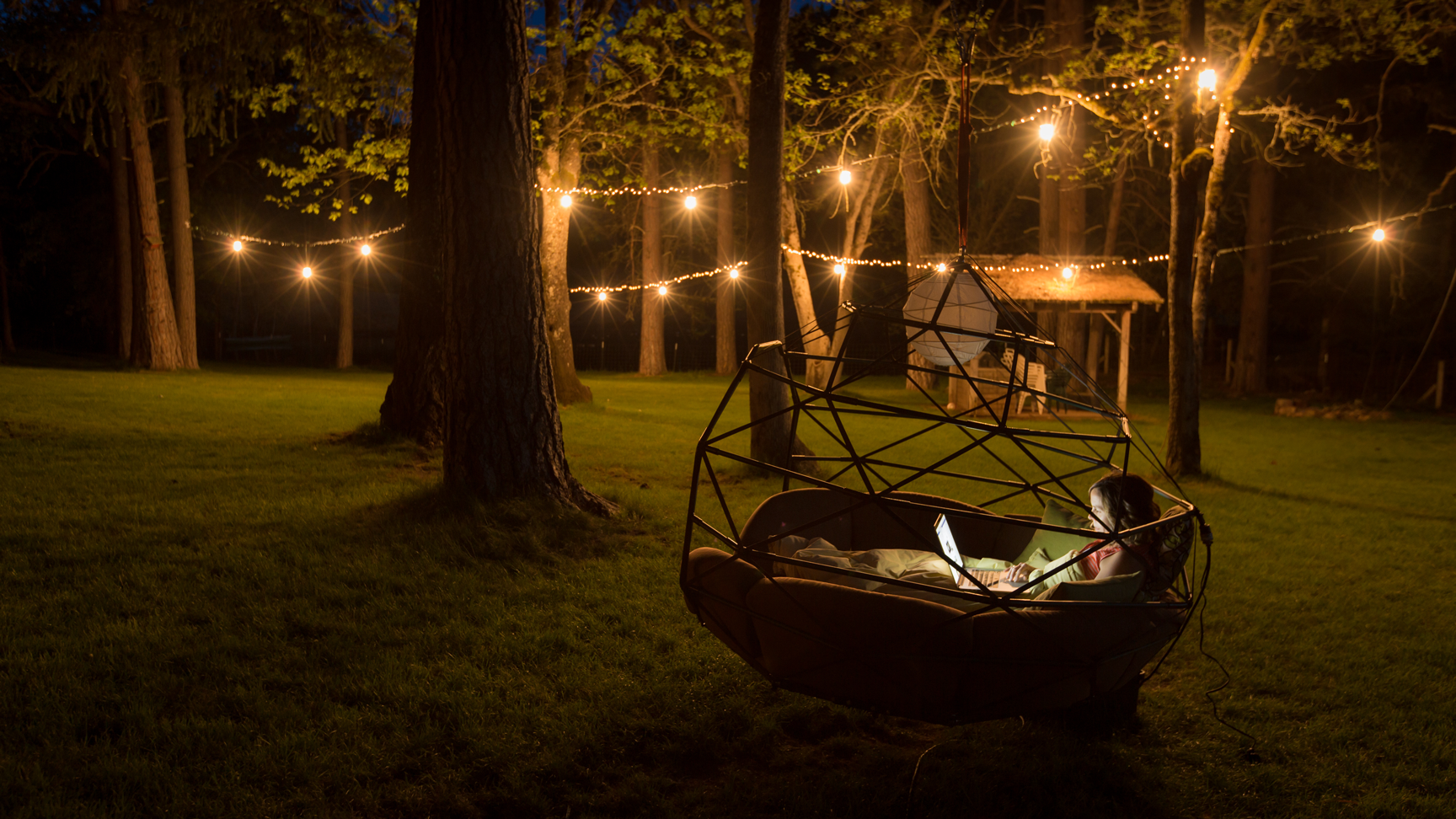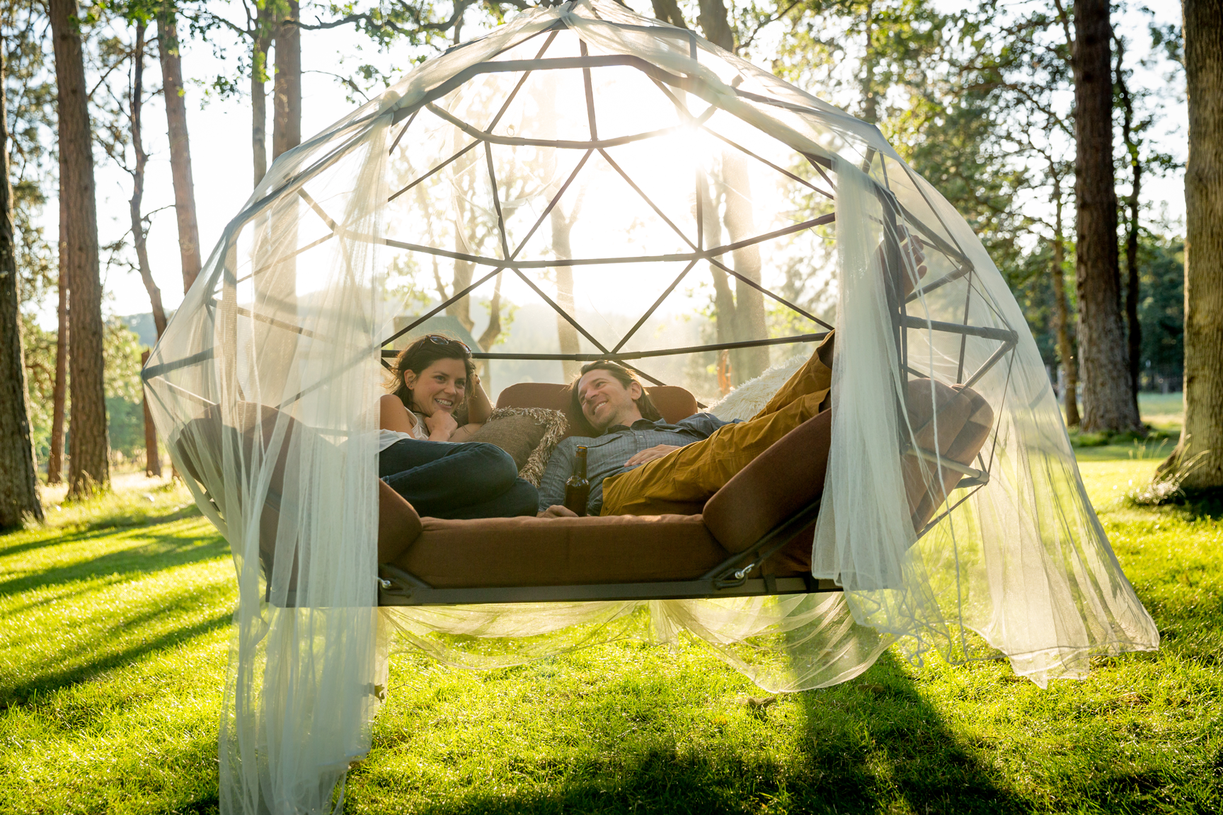The Kodama Zome is the next evolution of the hammock.  These geodesic dome inspired structures hang from a single overhead anchor, allowing for smooth and unrestricted pendulum motion in any direction. The gentle swaying is reminiscent of rocking in a cradle, and it is the perfect spot to relax with you self or with friends and enjoy the afternoon.