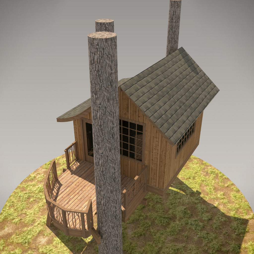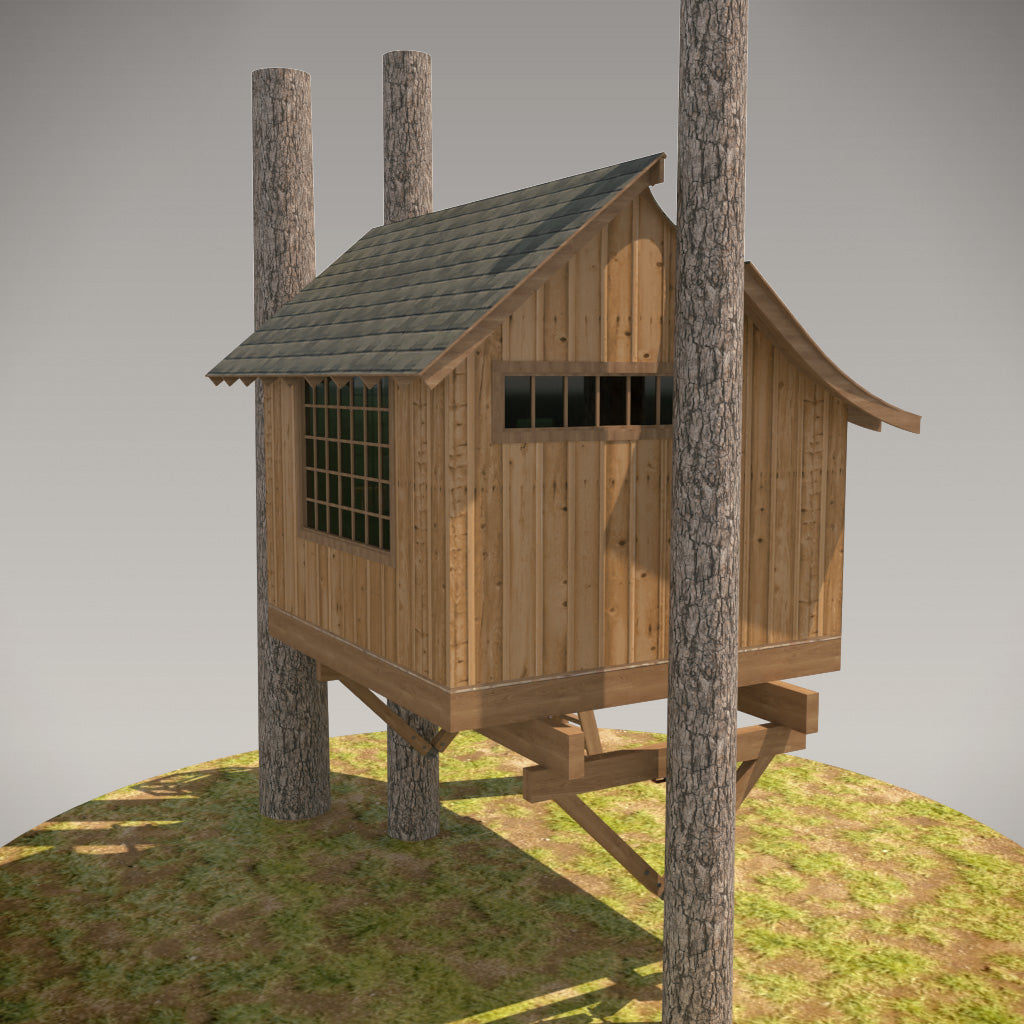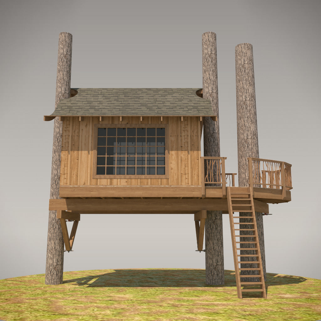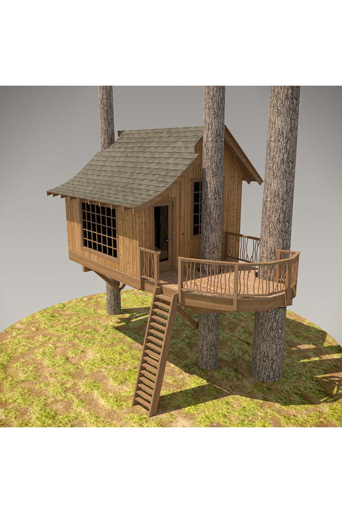 Modeled after the Upper Pond Treehouse at TreeHouse Point. The Tonasket Treehouse plan is the perfect backyard bunkhouse. With just over 170 square feet of interior space, there is enough room for a bunk bed (or two!) and small seating area for lounging up in the trees. The treehouse is accessed by a ships ladder leading up to the 82 square foot deck. A swooped roof adds whimsical charm and the two large divided glass windows allow lots of natural light.