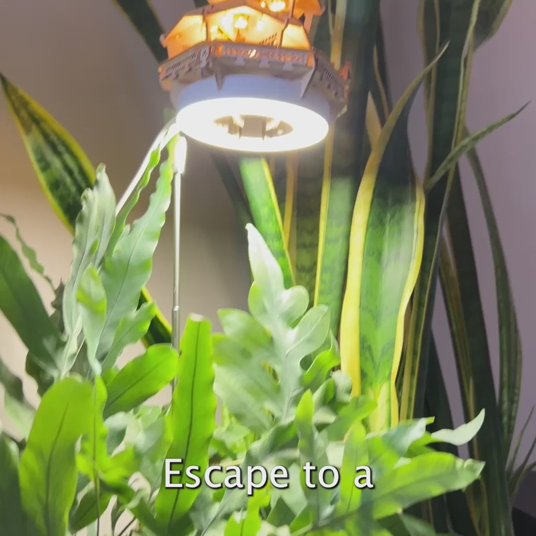 This laid-back beach-style hut features an open-plan layout with an overhanging staircase, thatched-style roofs, and a hammock on the balcony. Once built, it clips into a full spectrum LED grow light—height adjustable with dimmable brightness, auto timer (8/12/16 hours), and a 6.5ft USB cord, perfect for small to medium indoor plants.
