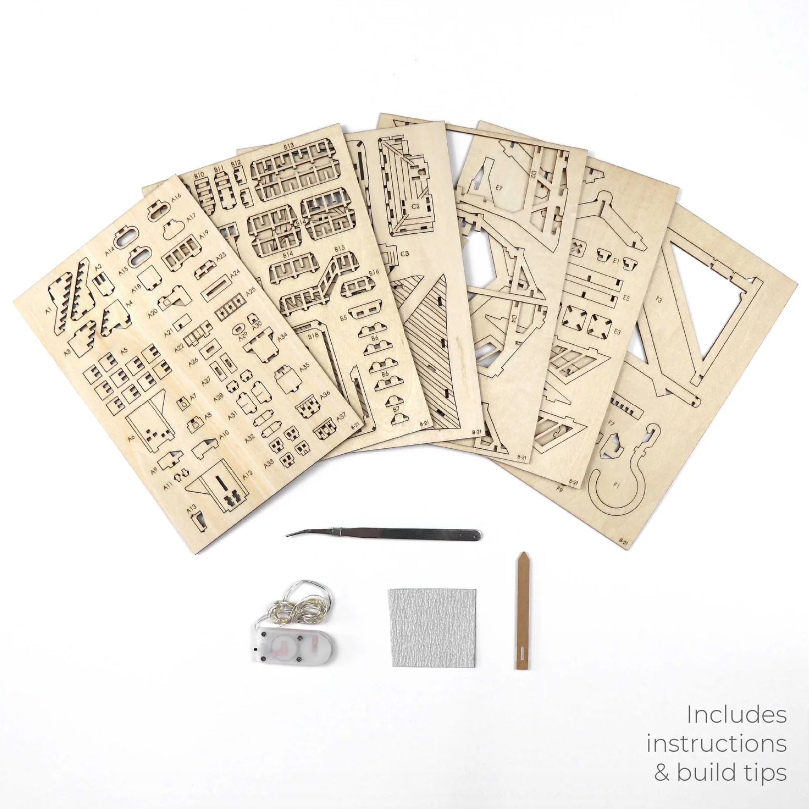 DIY wooden model kit with easy to follow instructions. Includes LED lights, acrylic stake (moisture resistant) and assembly tools.